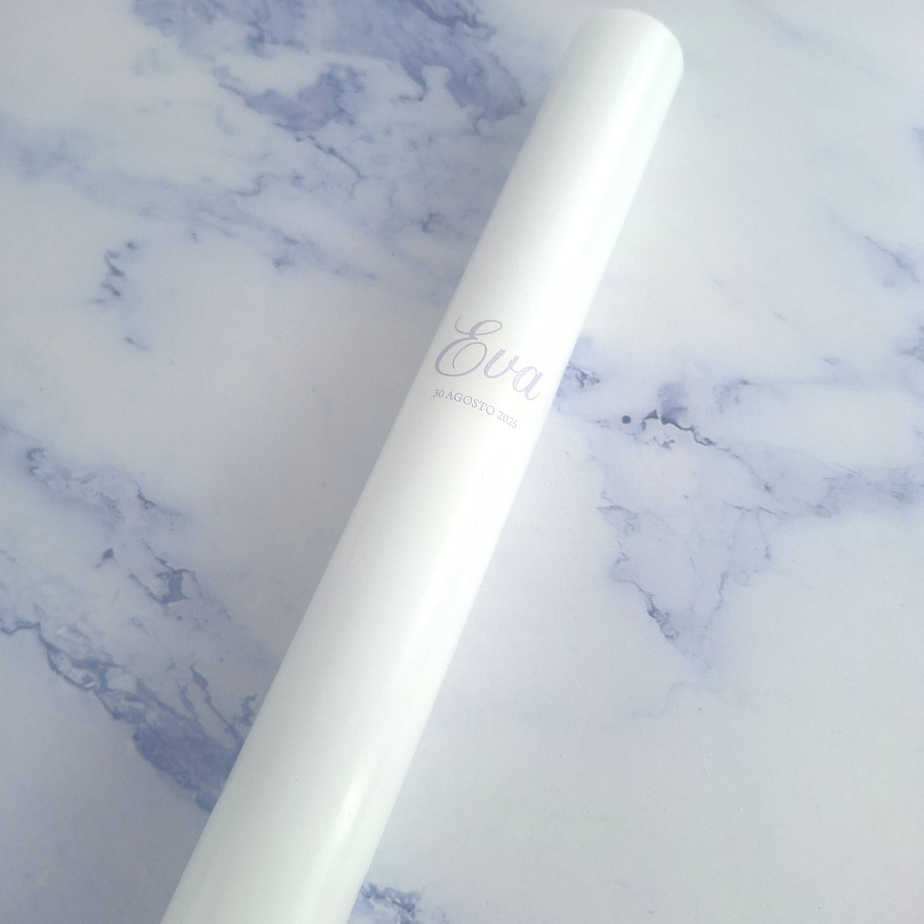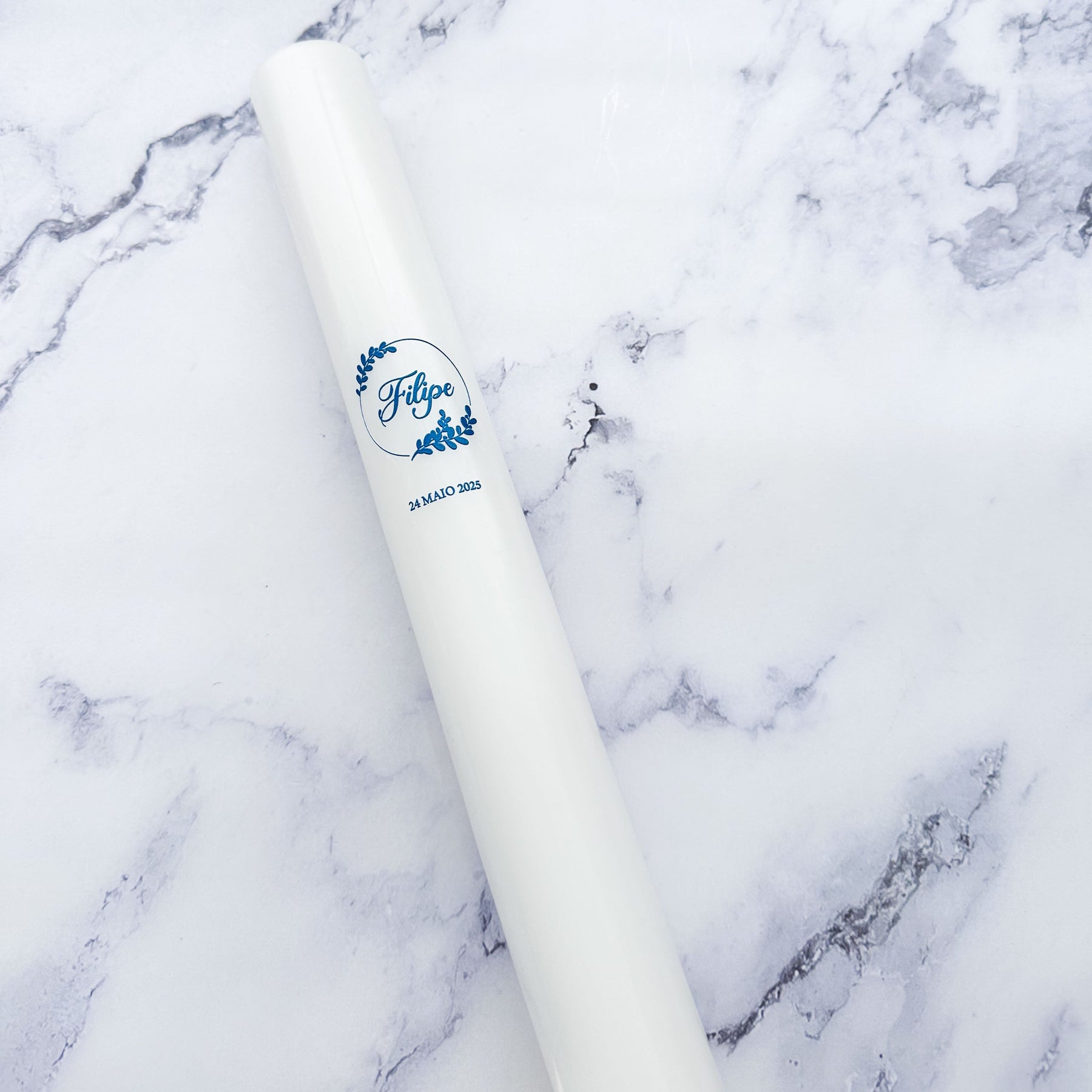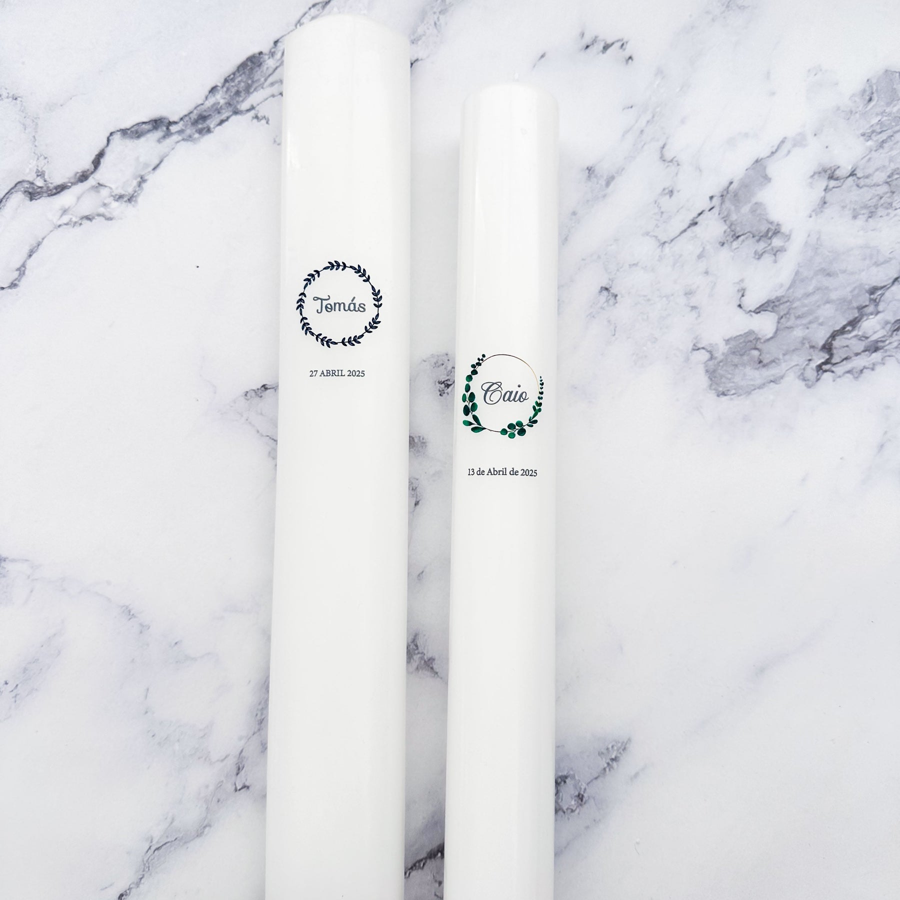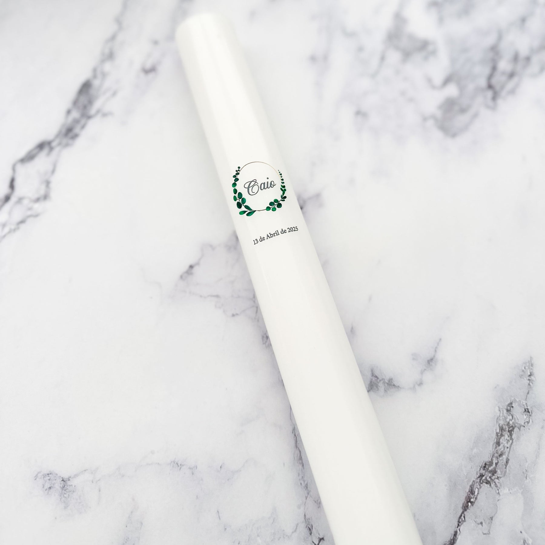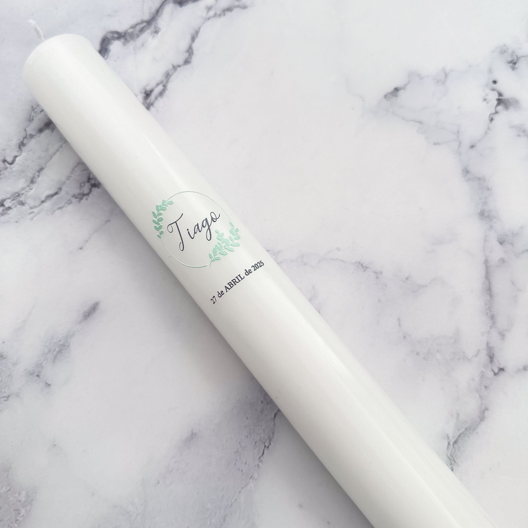 Esta Vela está disponível em três formatos muito requintados, e pode ser personalizada com o nome da criança e a data do evento. Além disso inclui a moldura ao redor da personalização, disponível em vários layouts diferentes. Vê na galeria de imagens todas as opções.