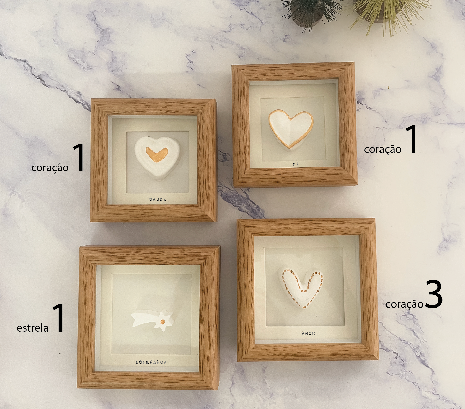 Dimensões do quadro: 10cm. Em madeira, vidro e cerâmica, segue com saco