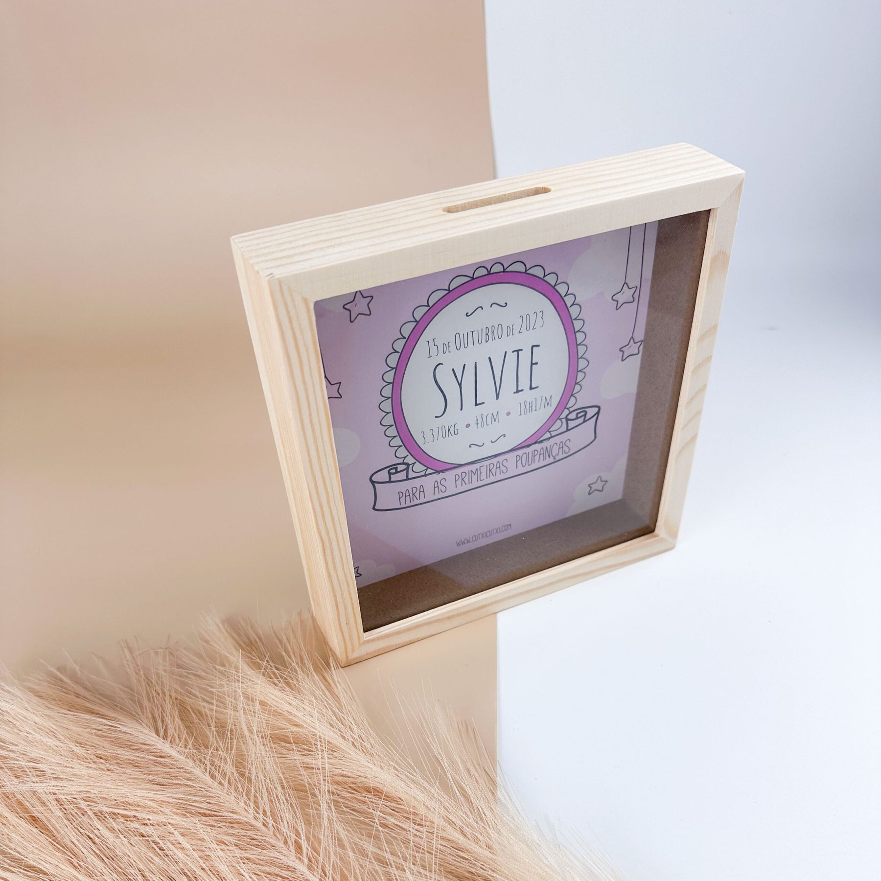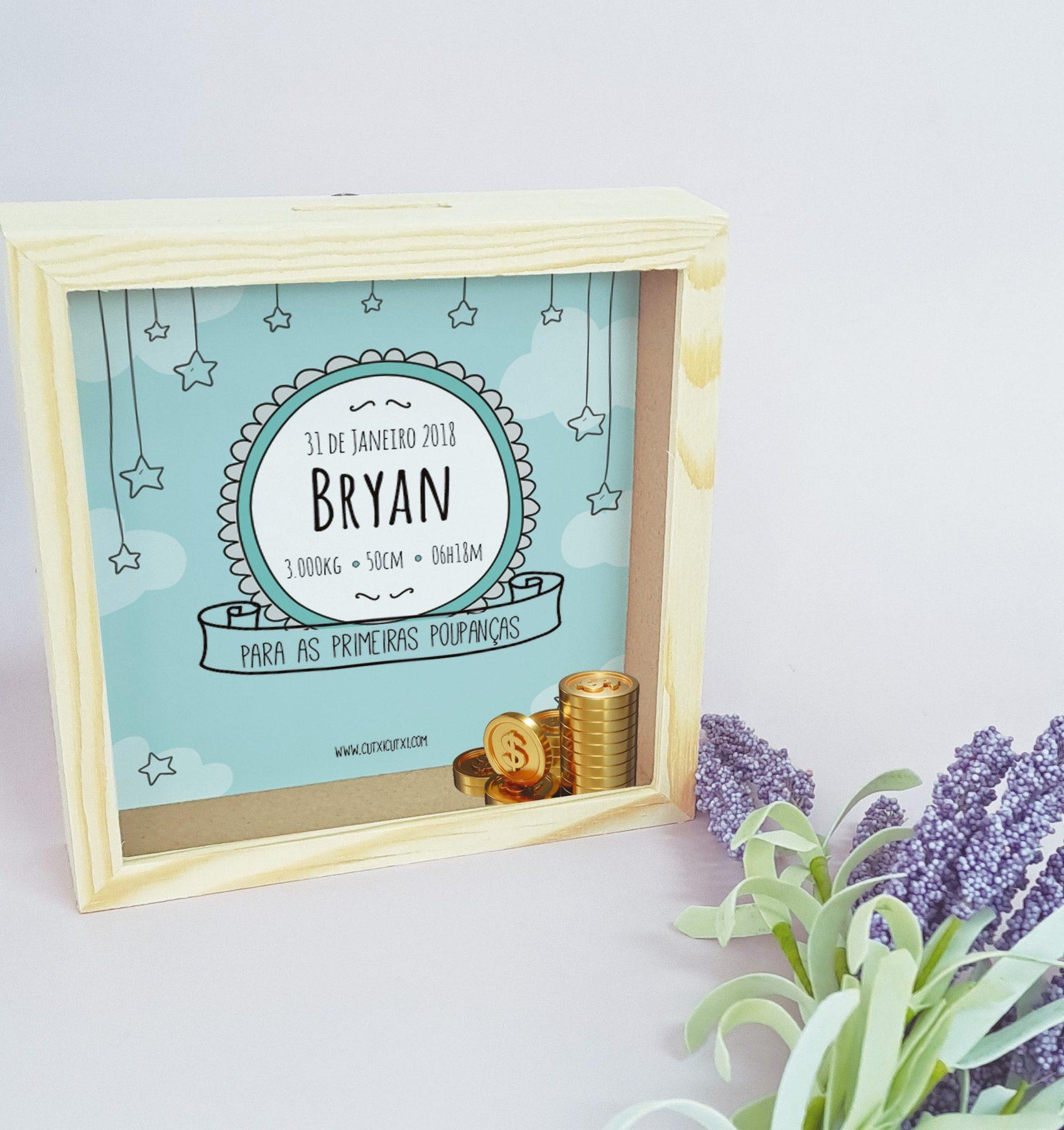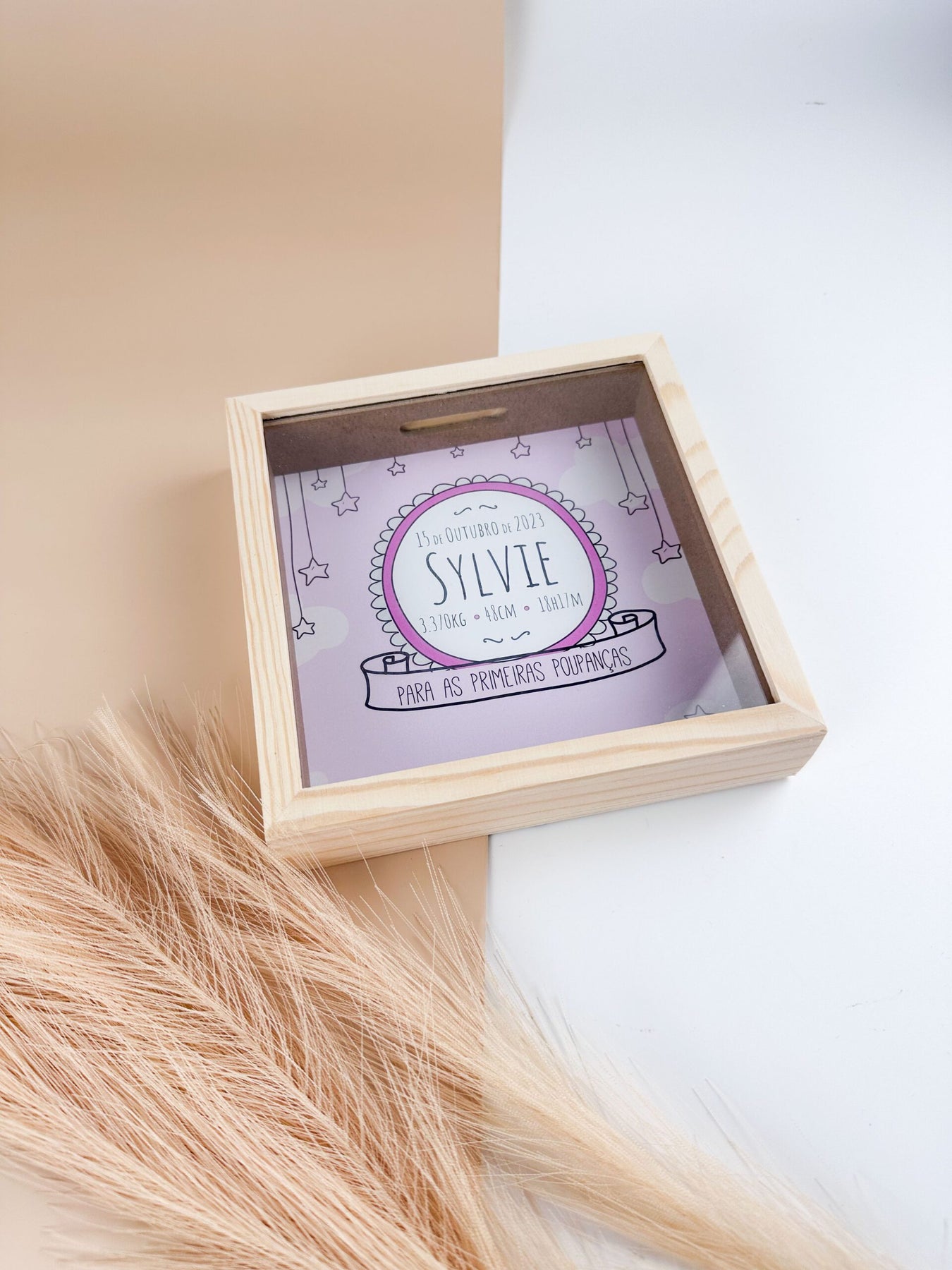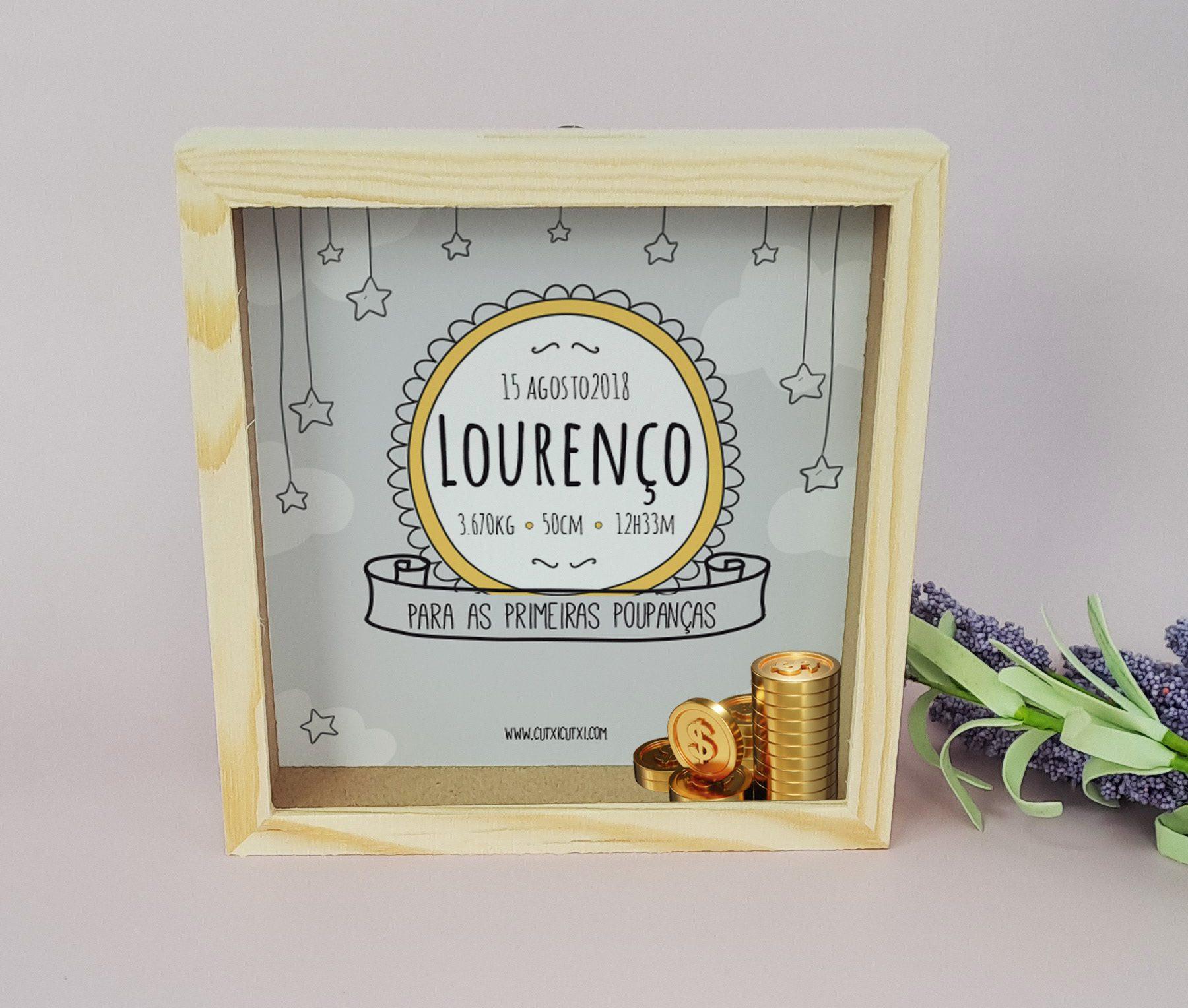 O mealheiro é feito de madeira e vidro, proporcionando um visual elegante e durabilidade. Além disso, é personalizado com o nome do destinatário, tornando-o um presente único e especial.