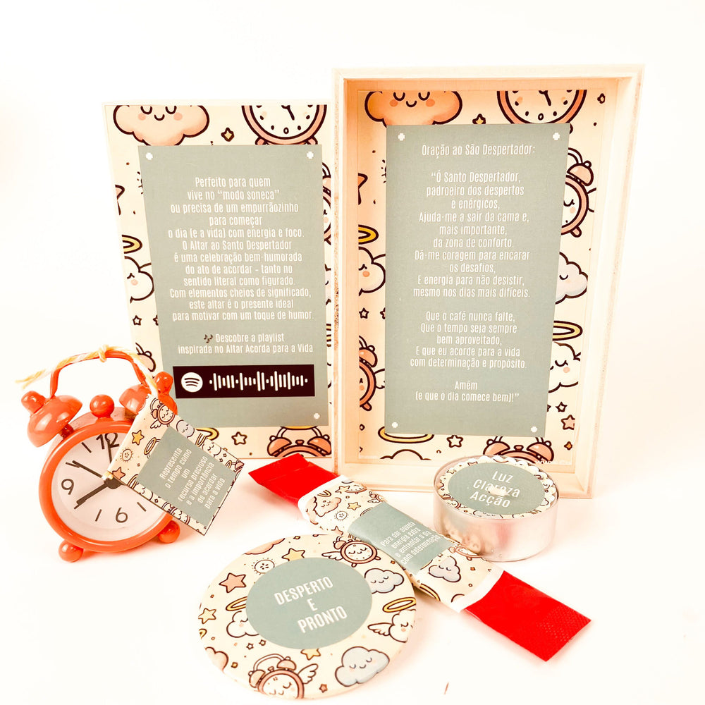 Para quem anda sempre no “modo soneca” – tanto no despertador como na vida – o Altar Acorda para a Vida é o presente perfeito para dar aquele empurrãozinho com humor e inspiração. Seja para arrancar da cama, enfrentar desafios ou sair da zona de conforto, este altar é o companheiro ideal para quem precisa de acordar para a vida com propósito e energia.