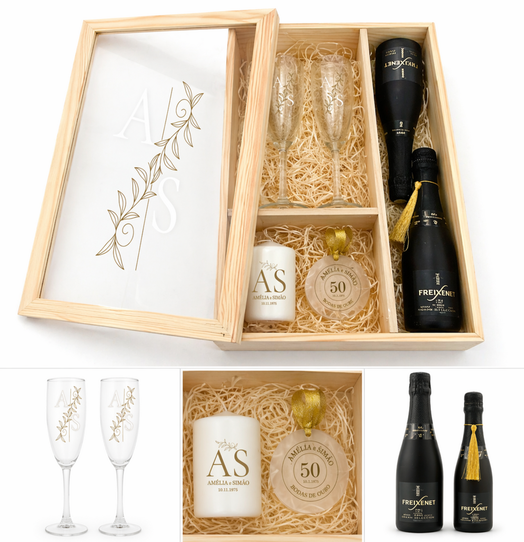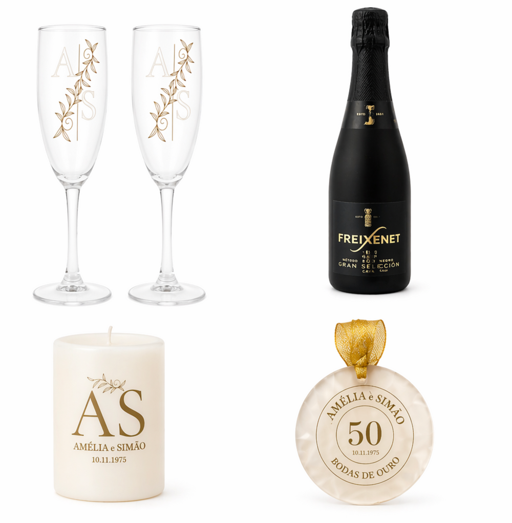 Presentes personalizados para bodas de casamento, criados à mão para comemorar cada ano de união. Desde as bodas de papel até às bodas de ouro, temos o presente perfeito para celebrar o vosso amor.