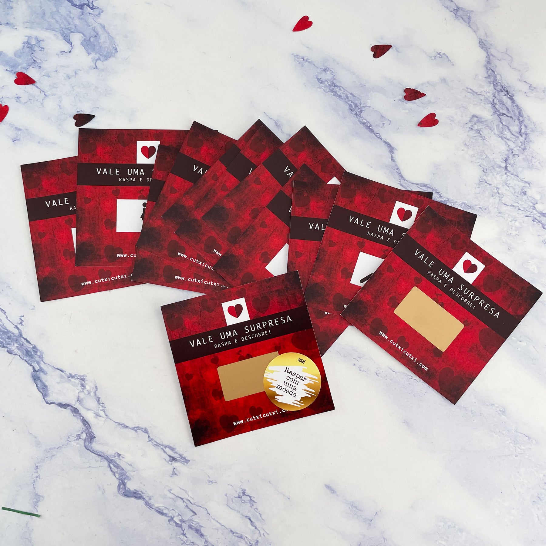 Um pack de 12 raspadinhas impressas em cartão de 250 gramas com oferta de caixa em cartão de 10cmx10cm com etiqueta personalizada com nome de quem recebe e quem oferece, colada no interior da caixa (facultativo)