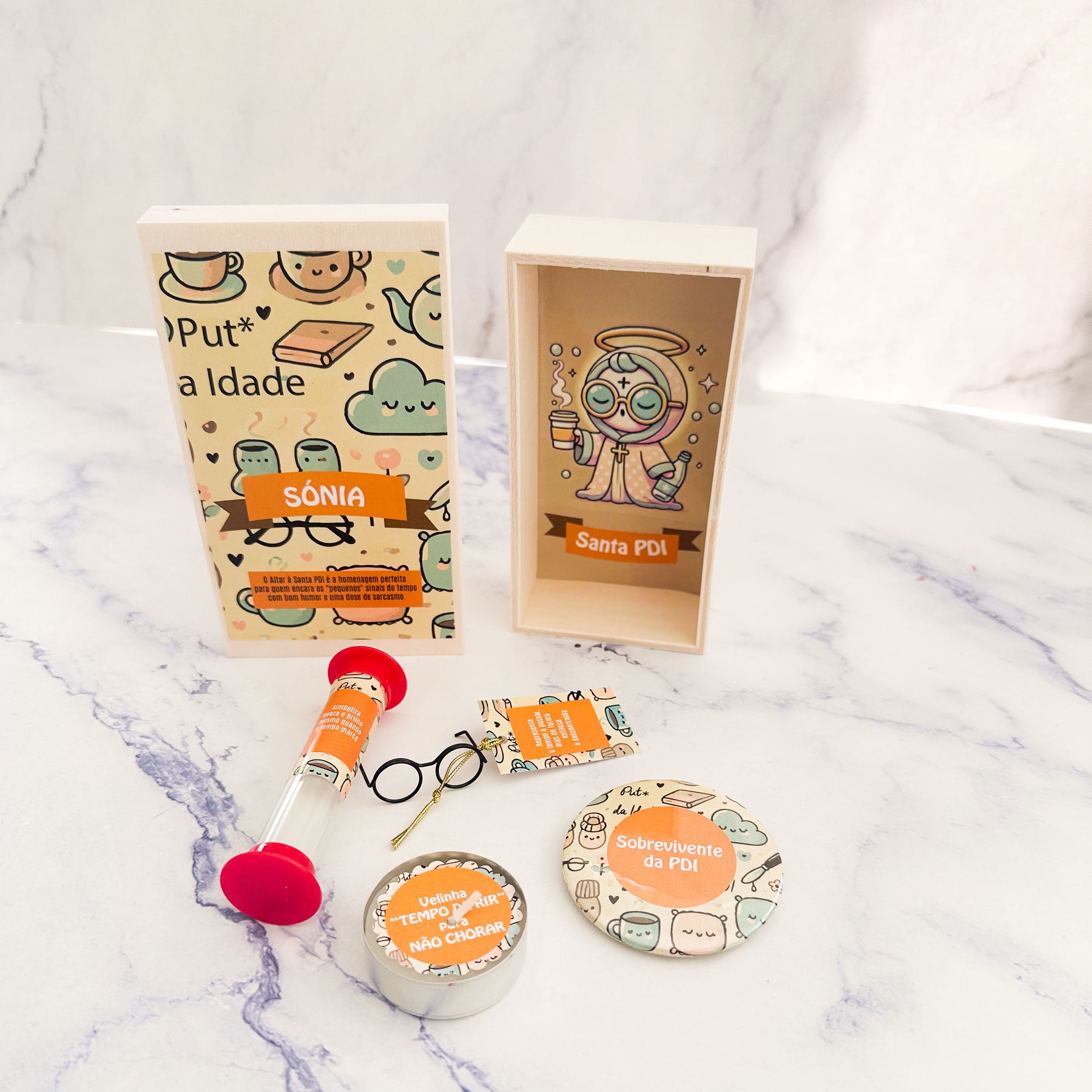 Se as articulações estalam, a memória falha e a visão já não é a mesma, o Altar à Santa PDI é o presente perfeito para encarar os sinais do tempo com humor e leveza. Inspirado na famosa “Put* da Idade”, este altar celebra com sarcasmo e carinho os desafios e as conquistas que vêm com a experiência (e os anos).