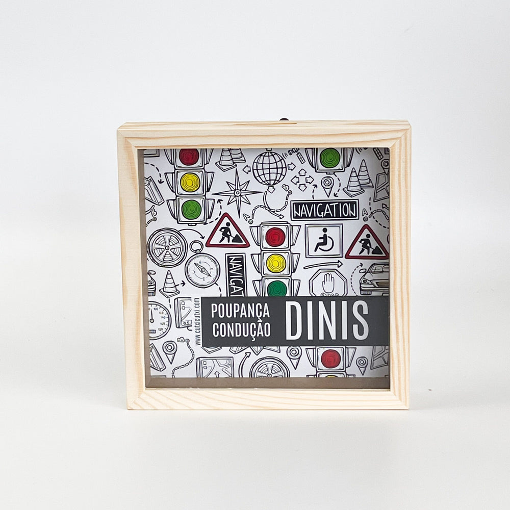 O mealheiro é feito de madeira e vidro, proporcionando um visual elegante e durabilidade. Além disso, é personalizado com o nome do destinatário e o tema "Poupar para a Carta de Condução", tornando-o um presente único e especial.