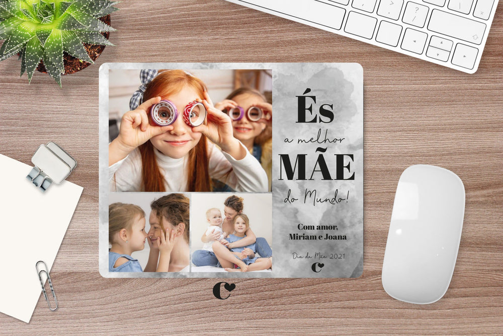 Mouse Pad Personalizado com fotografias. O texto e cores podem ser alterados ao seu gosto. Um bonito presente para oferecer naquela data especial como o Dia da Mãe.