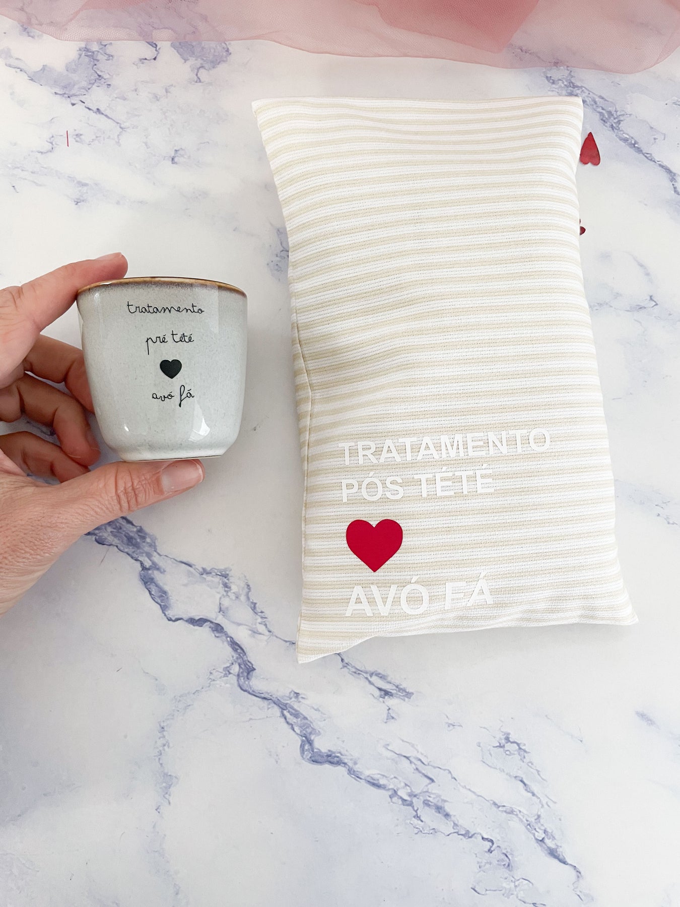 A chávena de café acompanha o conjunto com uma mensagem personalizada de tratamento pré (nome do bebé) – por exemplo: "Futuro Avô do João", "Futura Avó da Maria" ou "Avô em breve do Tomás".