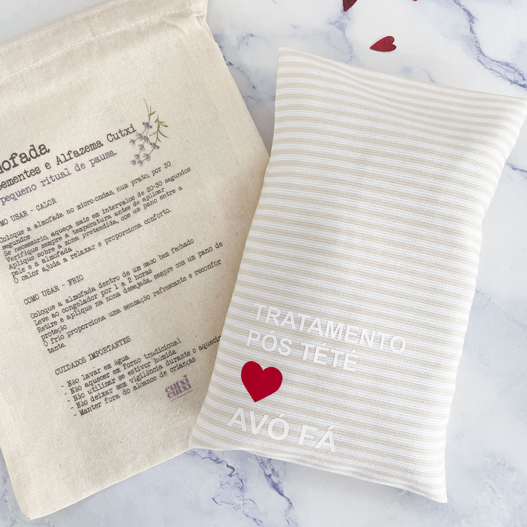 1. Almofada de sementes e alfazema (uso quente/frio) com frase pós-nome do bebé