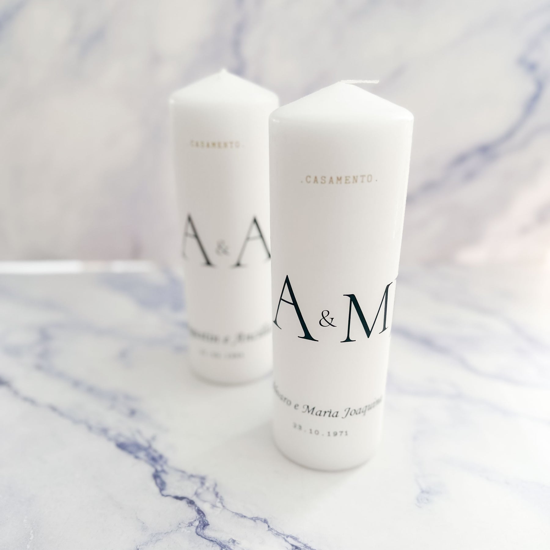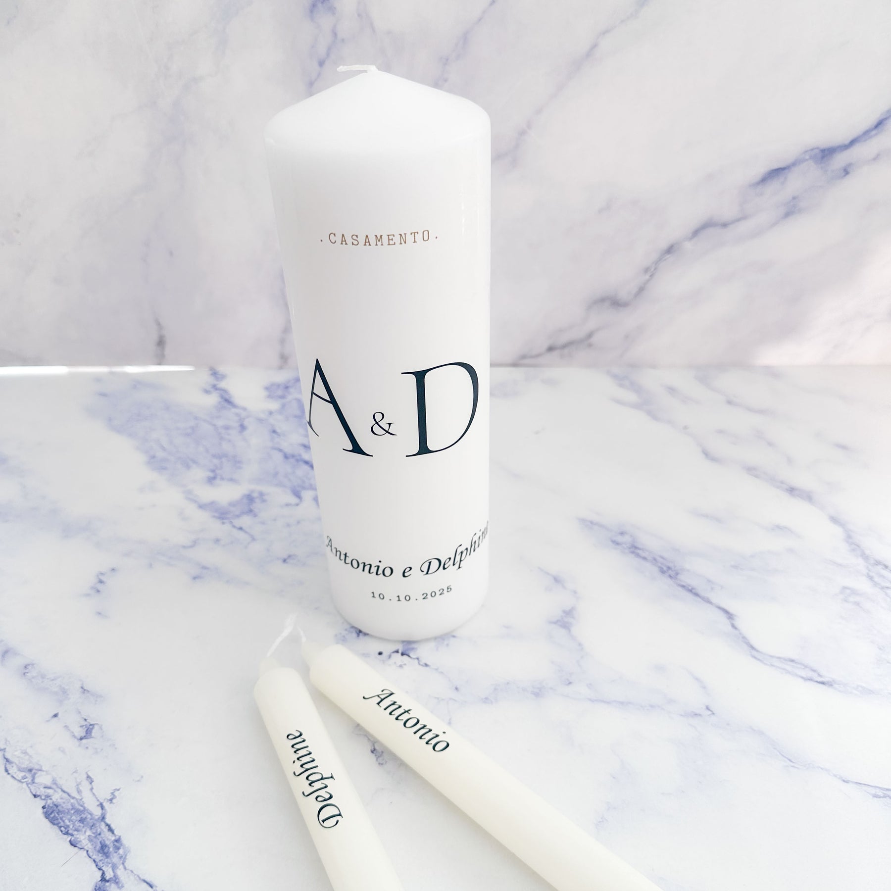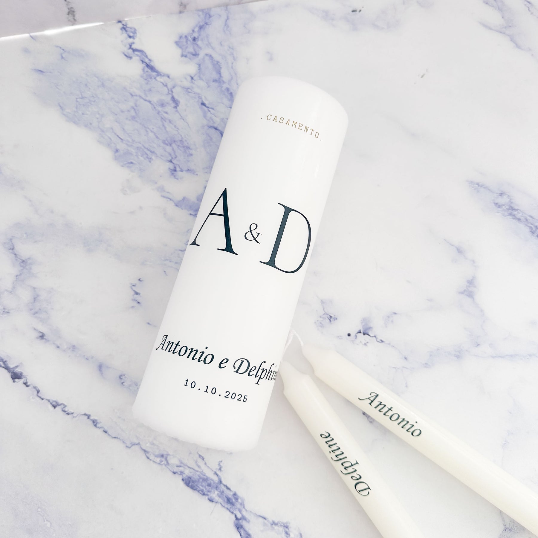 Este conjunto encantador de velas de parafina personalizadas é perfeito para a celebração do casamento. Inclui a personalização das iniciais, nomes do casal e a data da boda na vela central, além de duas velas menores com o nome de cada um, ideais para o ritual do casamento.