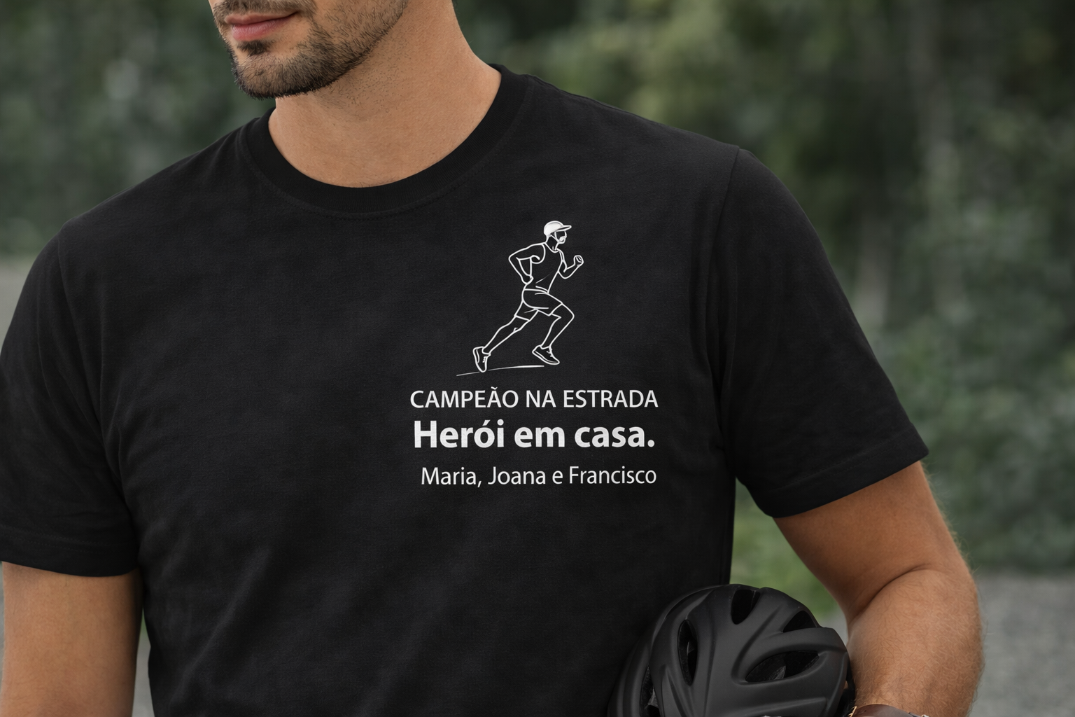A T-shirt personalizada “Campeão na Estrada. Herói em Casa.” foi criada para homens que encontram na corrida disciplina, foco e superação — valores que também levam para a família.