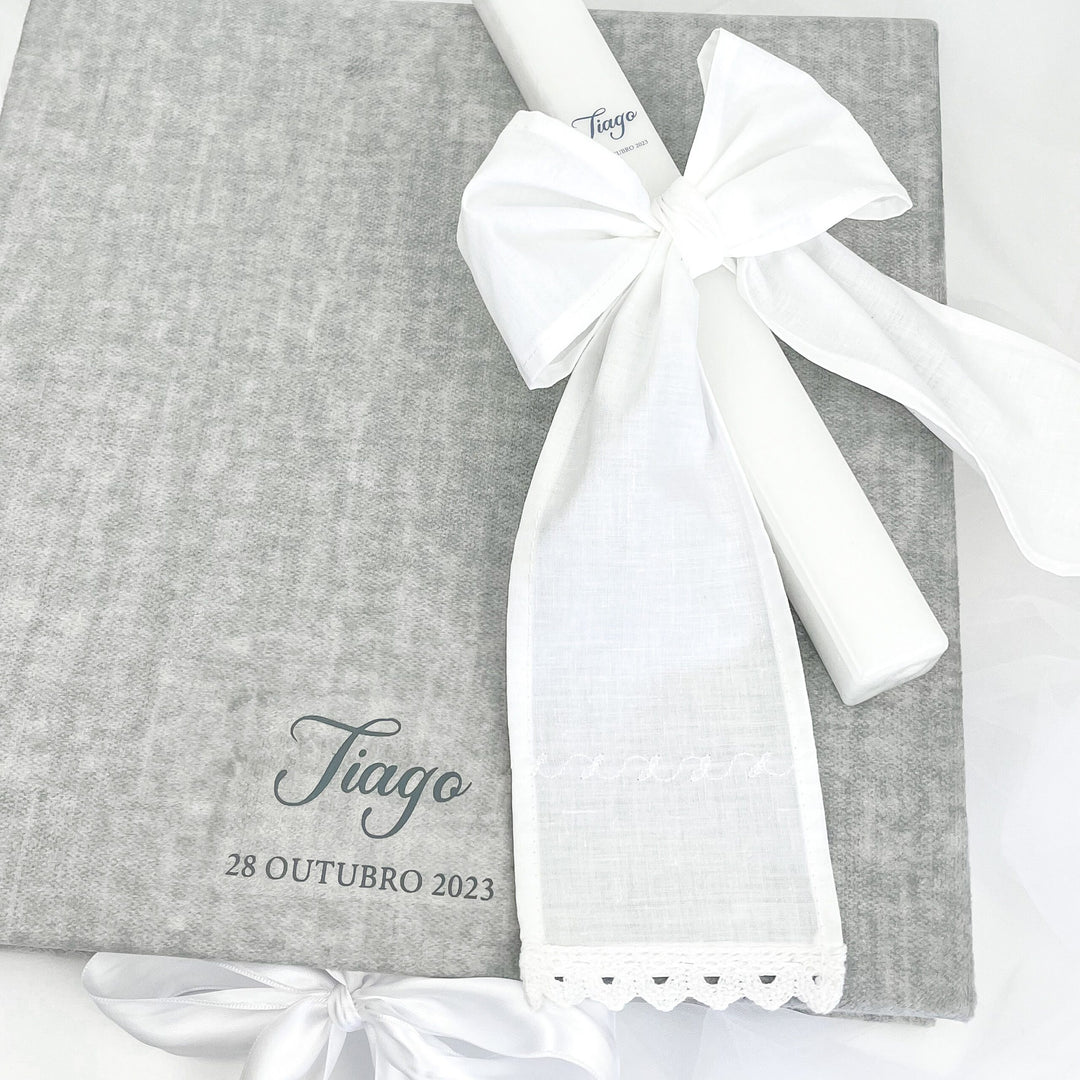Conjunto Batizado Linho Deluxe | Vela · Toalha bordada à mão · Caixa em veludo