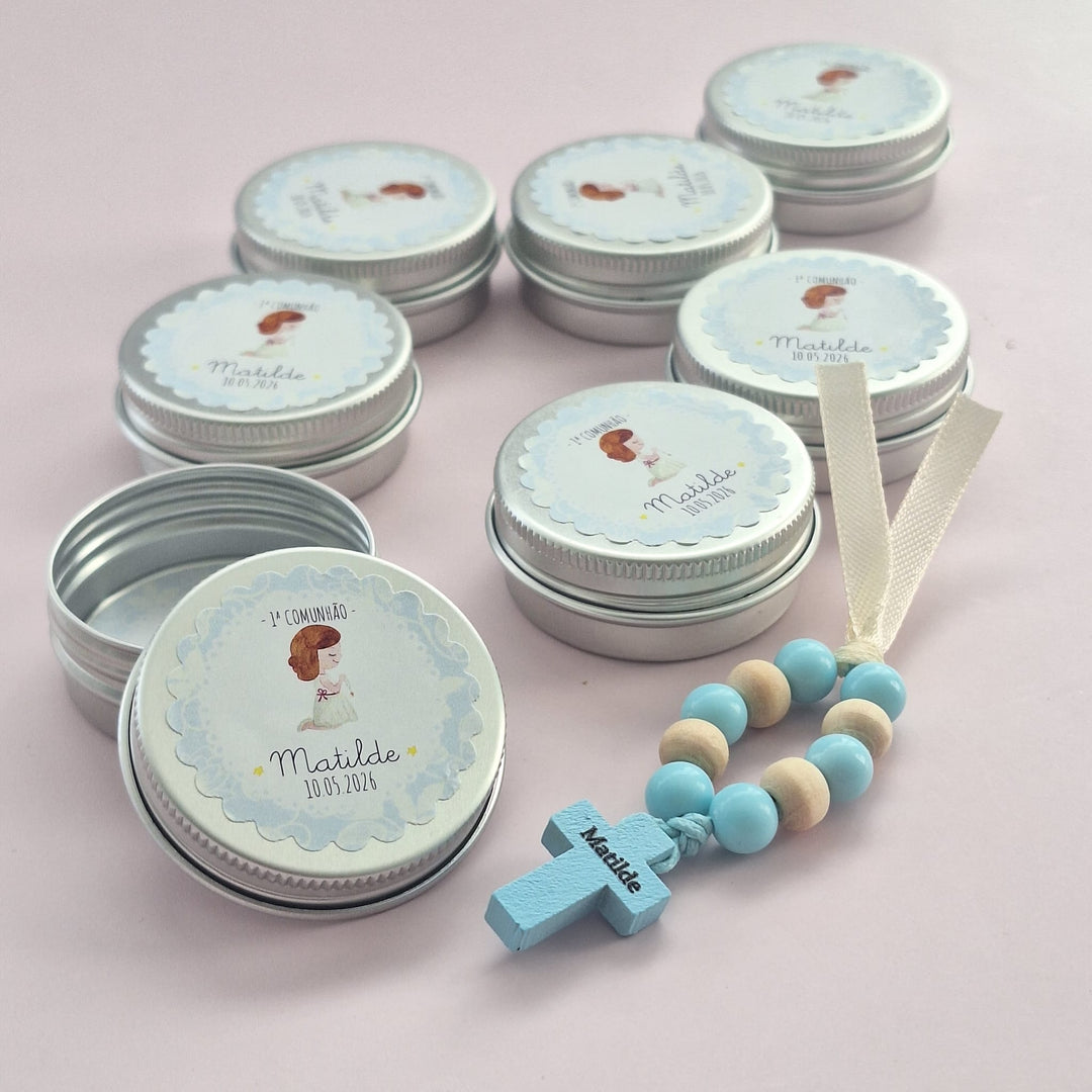 Mini Terço Dezena em Latinha com Nome - Lembrança Primeira Comunhão