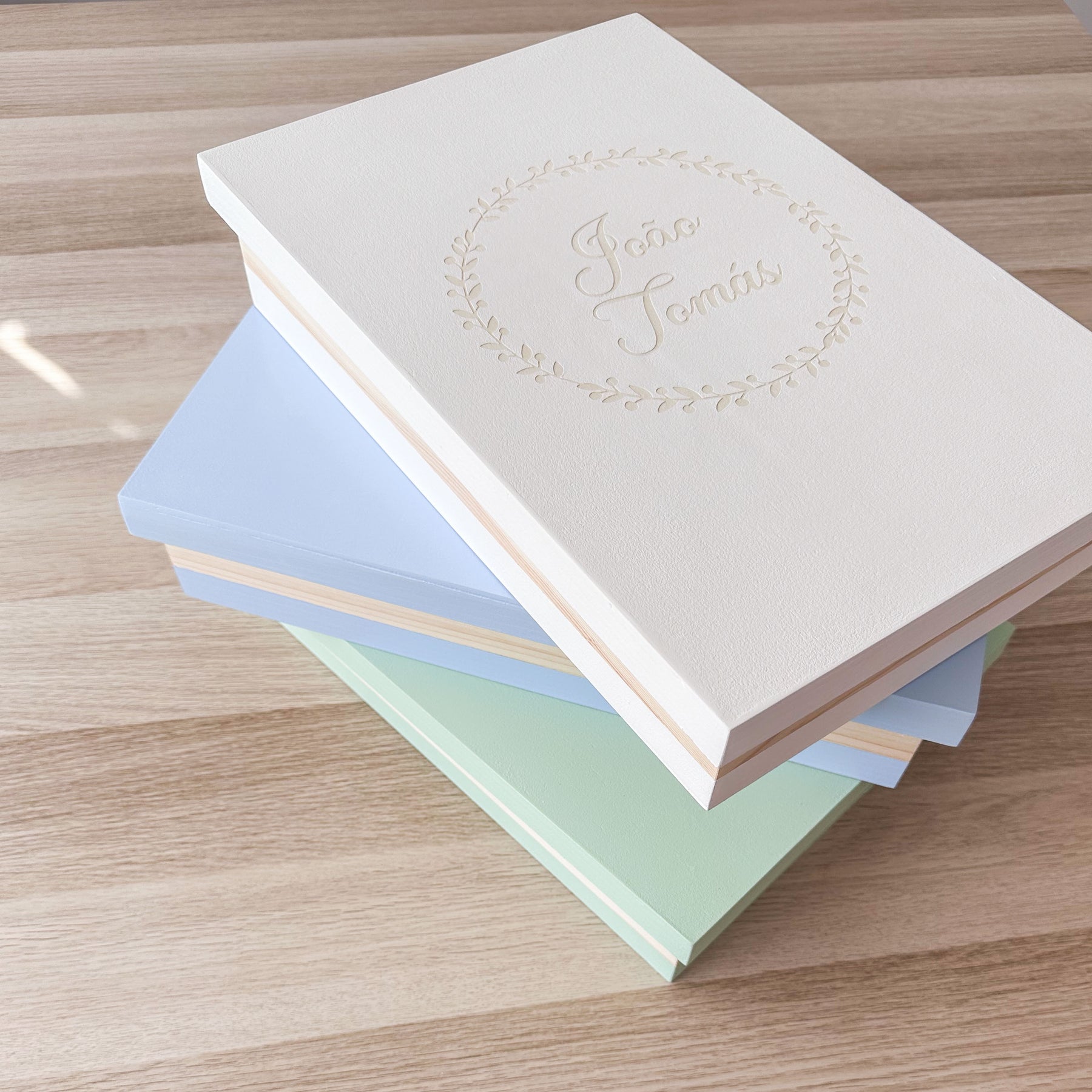 • Caixa de madeira, pintada à mão e personalizada com nome à escolha na tampa;