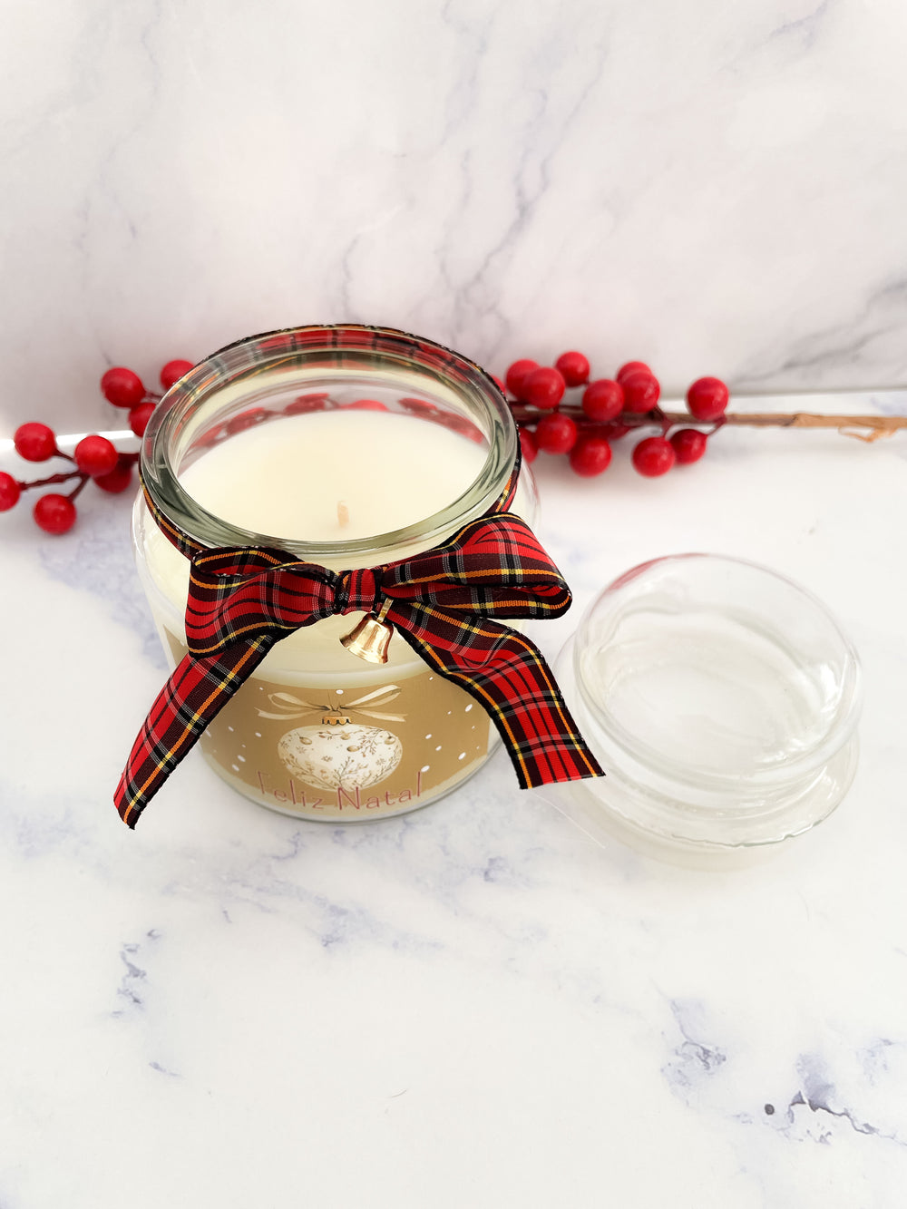 - Design: Frasco grande de vidro com tampa, decorado com um laço dourado e detalhes natalinos em vermelho.