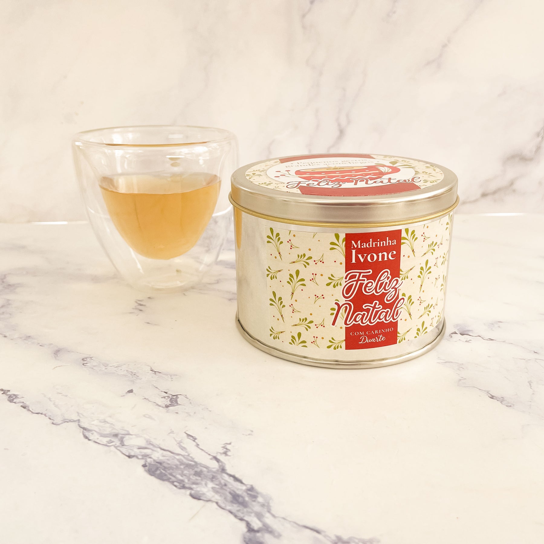 - Inclui Lata personalizada, saquetas de chá variadameias quentinhas, marcador de livro e bombom de chocolate