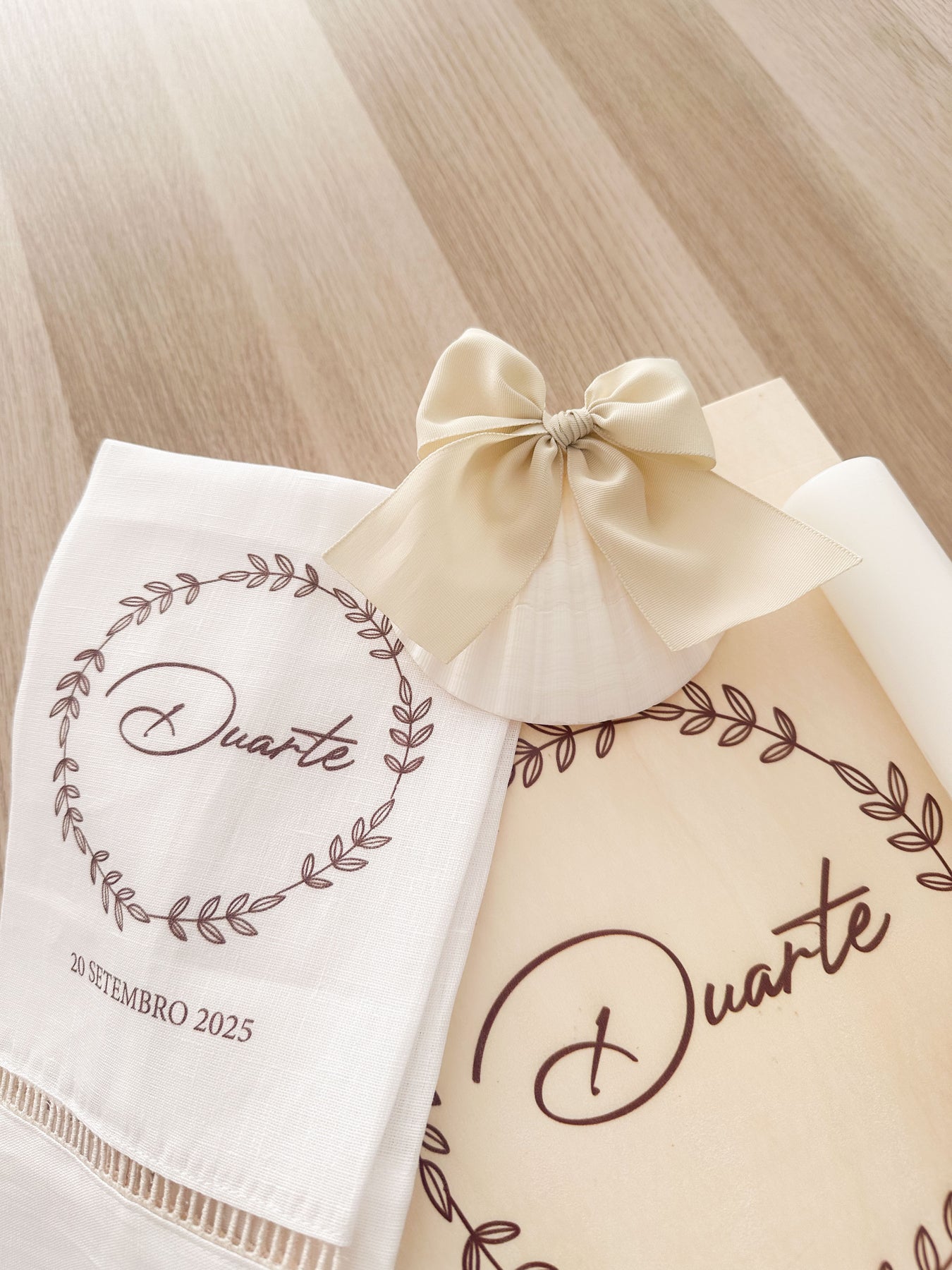Nas peças de Batismo coleção Divine Nature prevalece o toque da natureza com acabamento natural, presente nas caixas de madeira, na concha de vieira natural e na toalha de linho com franja ou com ajur, personalizada.