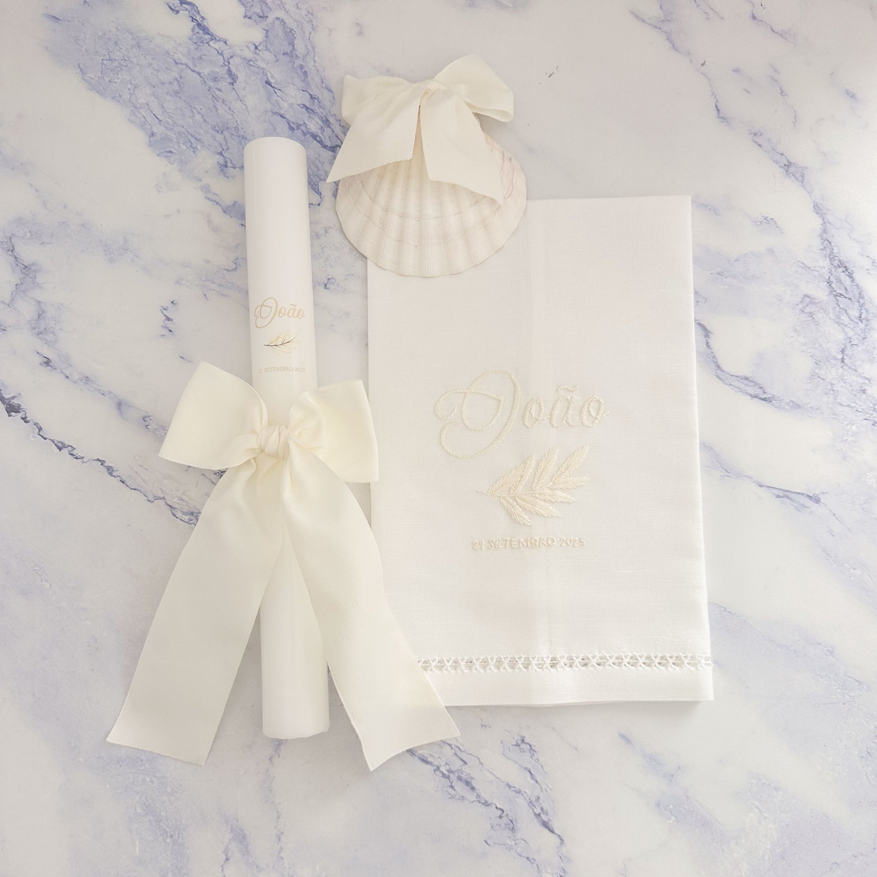 Os artigos de Batismo Coleção Divine Nature, estão disponíveis em Vela, Concha, Toalha Bordada à Mão e Caixa em Natura;