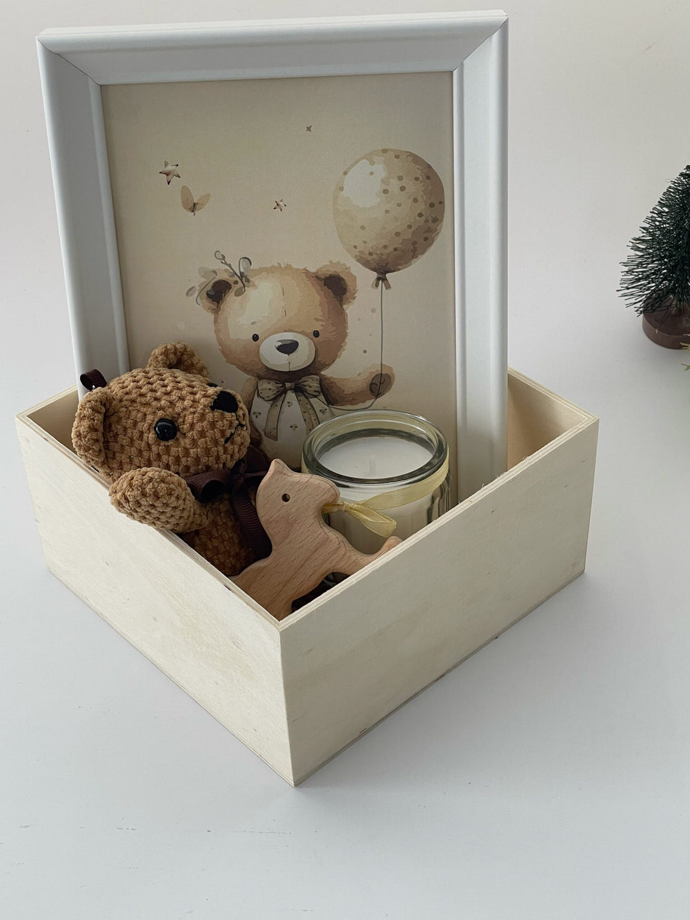 - Conteúdo: Quadro decorativo, pelúcia, brinquedo de madeira, vela aromática;